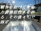 水道水またはお好みの天然水で白湯を作ります→白湯1リットルに対して調合液1cc霧吹きで細かく噴霧して添加されてください→密封ボトル(ダイソーなどで販売されている化粧水ボトルに充填して冷蔵庫で保管熟成(4℃が最適温度)を行います。